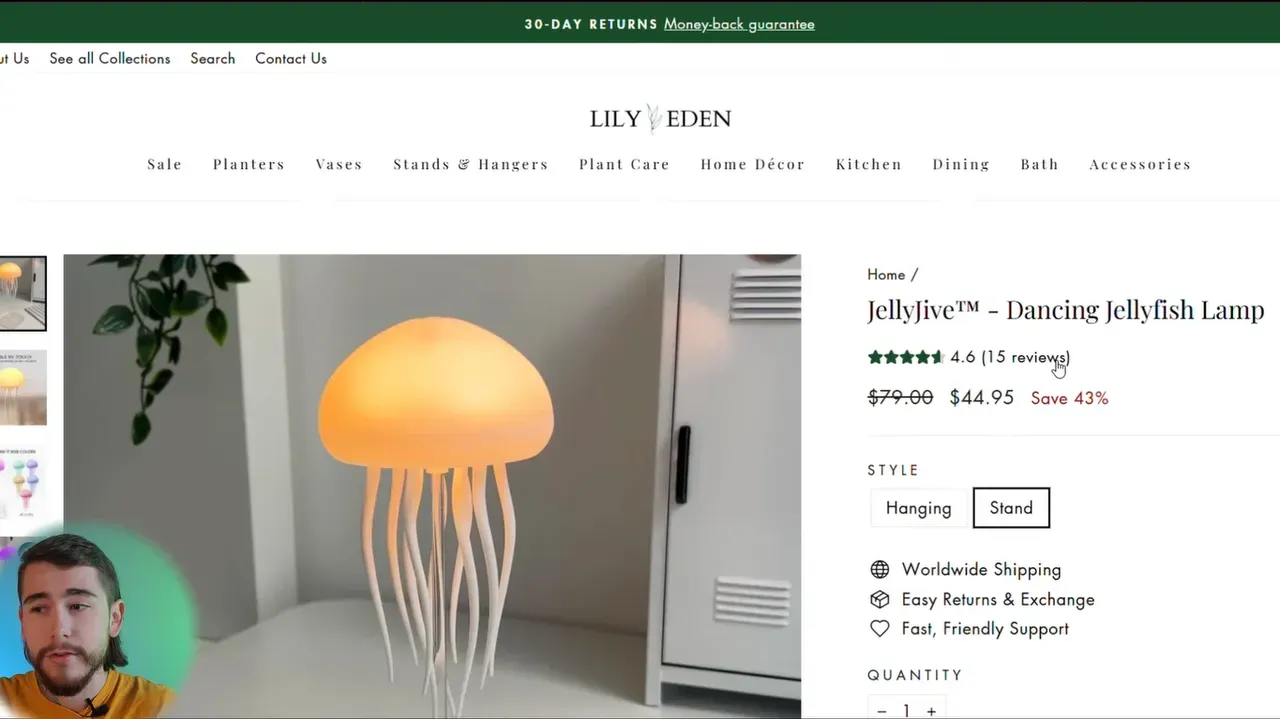 Trước khi xây, Alex luôn dành thời gian nghiên cứu đối thủ để lấy cảm hứng. Anh mở Google, gõ tên sản phẩm, quan sát cả kết quả quảng cáo lẫn kết quả tự nhiên, rồi mở từng cửa hàng trong tab mới để so sánh. Trong ví dụ của anh, cửa hàng đang bán đèn sứa với doanh thu hơn 200.000 đô mỗi tháng có trang chủ rất bài bản: chia mục rõ ràng như Furniture, Lighting, New Arrivals, Botanicals, Plant Care, có banner, testimonial, badge và cả feed Instagram.